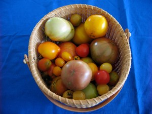 …and I’ve got a basket full of tomatoes under my arm. Yellows, reds, blacks, and greens, all just begging to be munched.