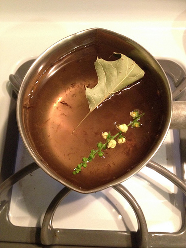 Thunderstorm water, leaf from a lightning-stuck oak, agrimony.