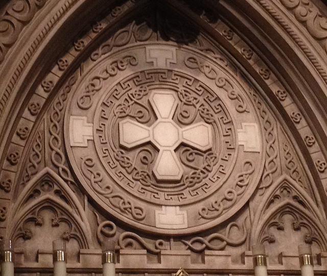 I stayed for a while, meditating on the significance of the symbols incorporated into her chapel. The knotwork surrounding the cross on the altar between the statues of Brigid and Bernard made a contemplative mandala that was wonderful to ponder. The cross itself was the equal-armed solar form, found so often in Celtic countries. The twisting vines surrounding the cross at first appeared asymmetrical, until closer observation reveals the pattern. (There are, in fact, asymmetrical elements, which makes for a fun visual treasure hunt.) A spiral graces the center of the cross on Brigid’s pedestal. In short, the whole altar seethes with the verdant power of Eire.